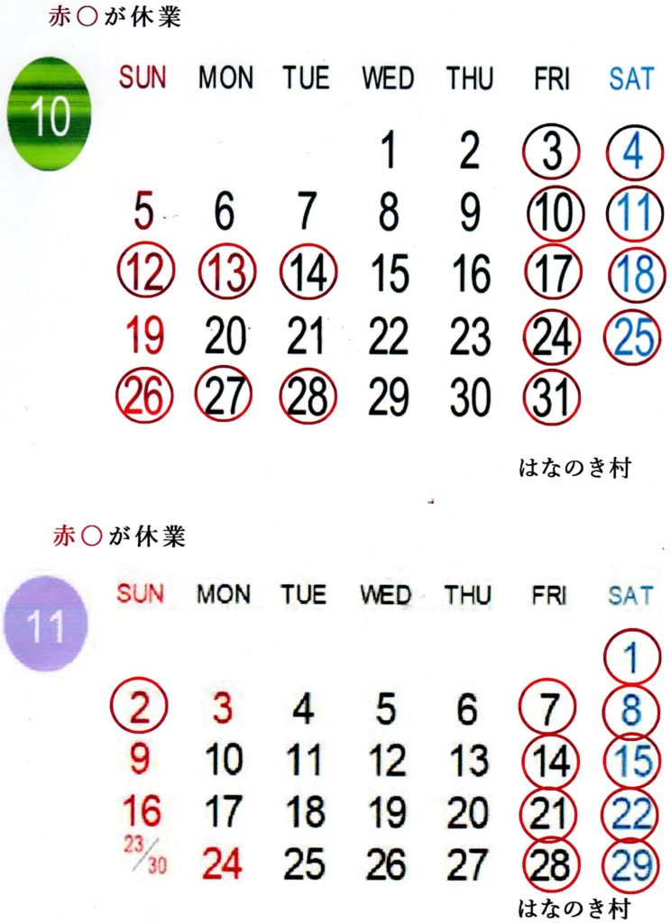 10月11月は通常の休業日に加え、下記の臨時休業をいただきます。